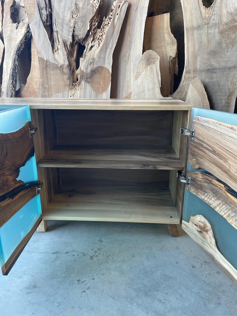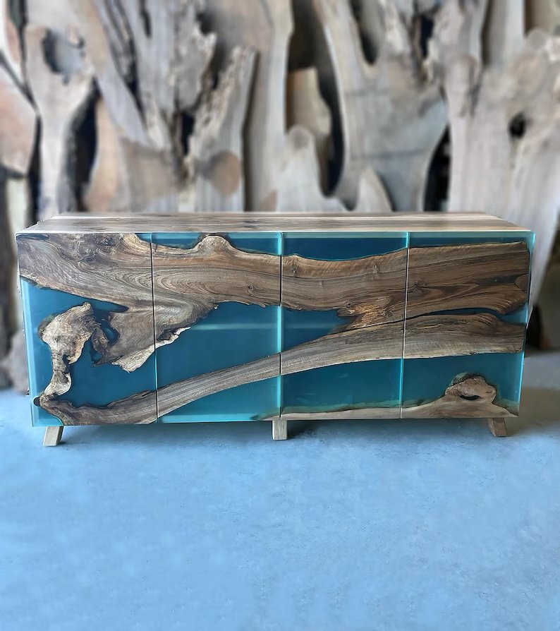 This handcrafted buffet is made from solid natural wood, suspended within a bold ocean-blue epoxy field that frames the grain like a living landscape.