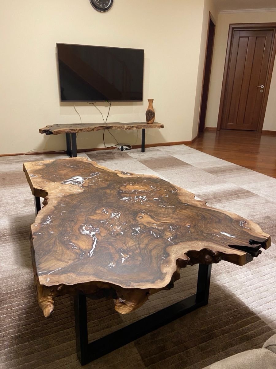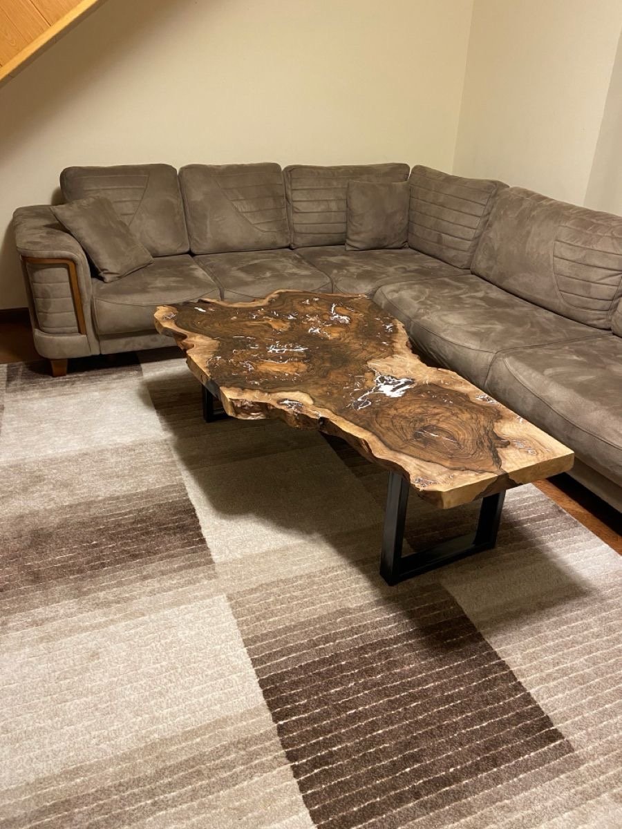 Supported by sleek black steel legs, the design blends rustic warmth with modern structure. Perfect for contemporary, industrial, or luxury interiors, this table becomes the natural focal point of any living space.