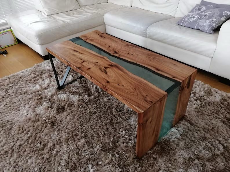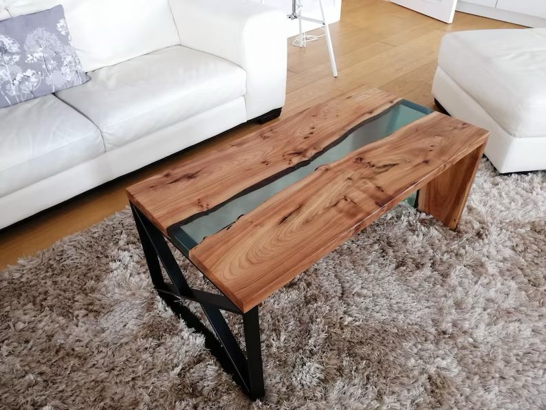 The Crystal Stream Coffee Table is a refined blend of solid wood and clear epoxy elegance. Two carefully selected wood slabs are united by a translucent river running through the center, creating a clean and modern visual flow.