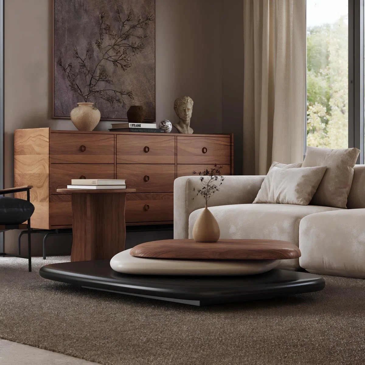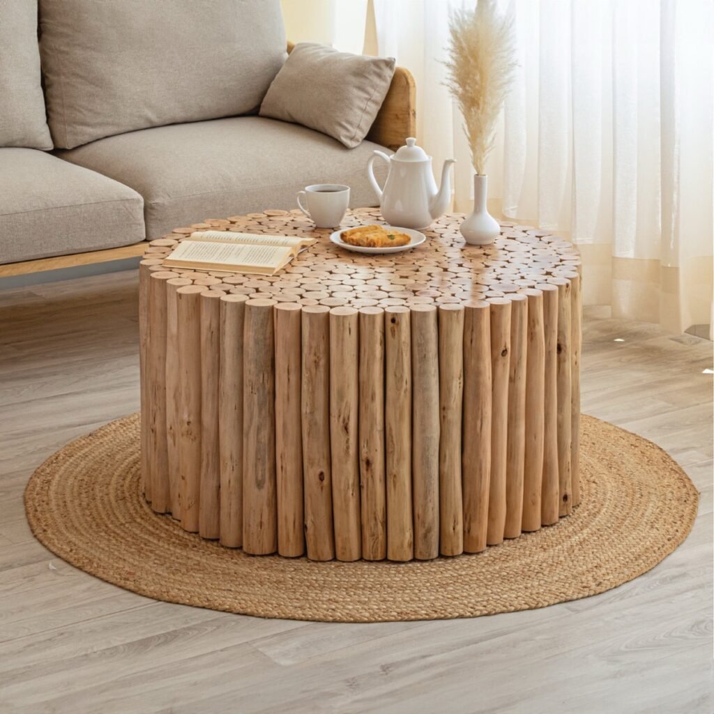 An artistic coffee table designed with layered surfaces that combine smooth curves and natural wood tones. Its sculptural form transforms it into a functional art piece, ideal for modern living spaces that value creative design. The balanced structure offers both visual impact and practical usability for daily living.