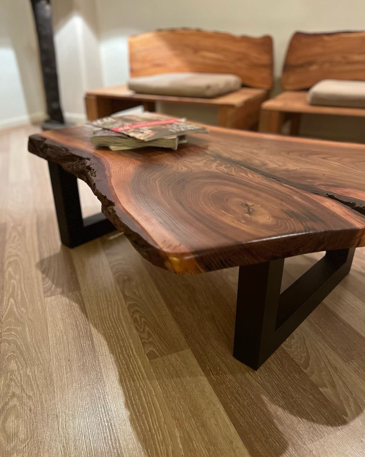 Golden honey tones blend beautifully with deep natural markings, creating warmth and depth that instantly elevate any living space. The matte black steel base adds a bold architectural contrast, balancing rustic charm with modern minimalism.