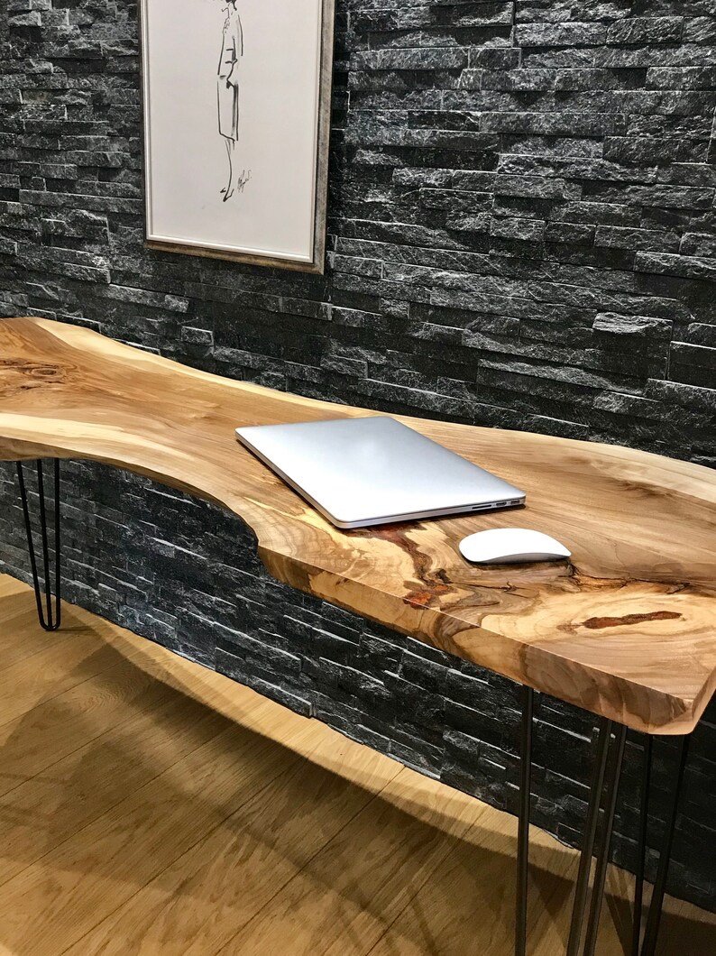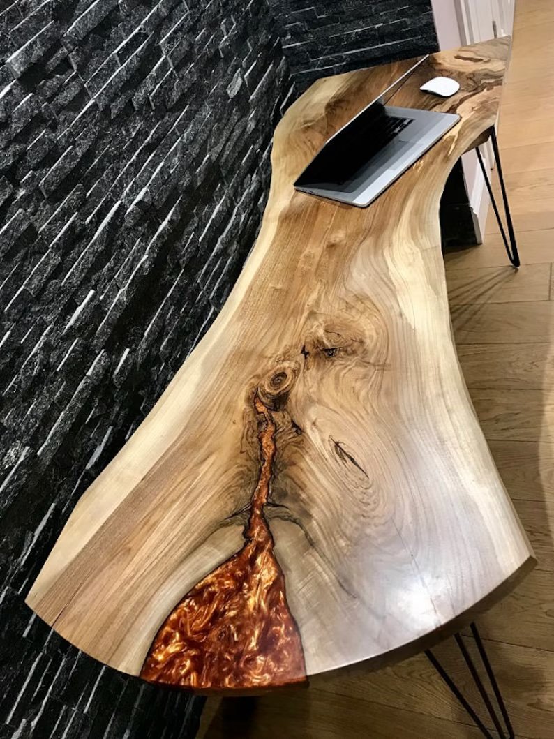 This handcrafted live-edge desk celebrates the raw beauty of solid wood enhanced by a striking epoxy accent.