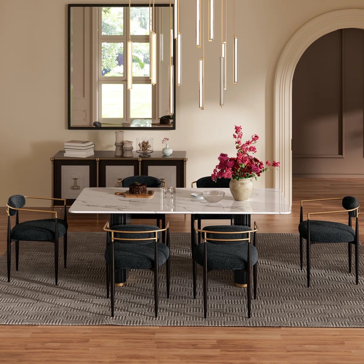 This stunning dining set features a sleek faux marble-textured tabletop that radiates sophistication while being easy to maintain. Paired with French-style dining chairs, each chair boasts a stylish ring-shaped fabric cushion and backrest pad, bringing both luxury and functionality to your dining space. The table’s clean lines and durable surface make it perfect for hosting family dinners, entertaining guests, or enjoying quiet meals.