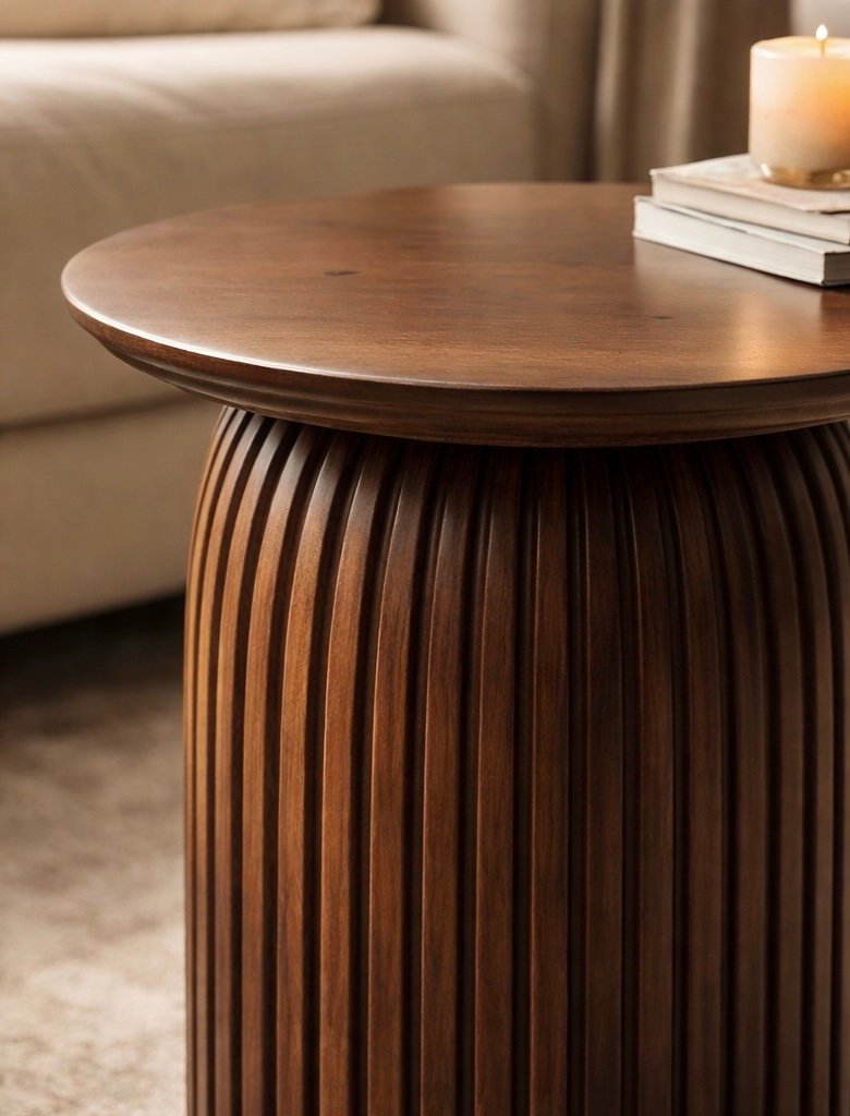 A modern fluted wooden side table crafted from solid wood with a warm walnut finish.