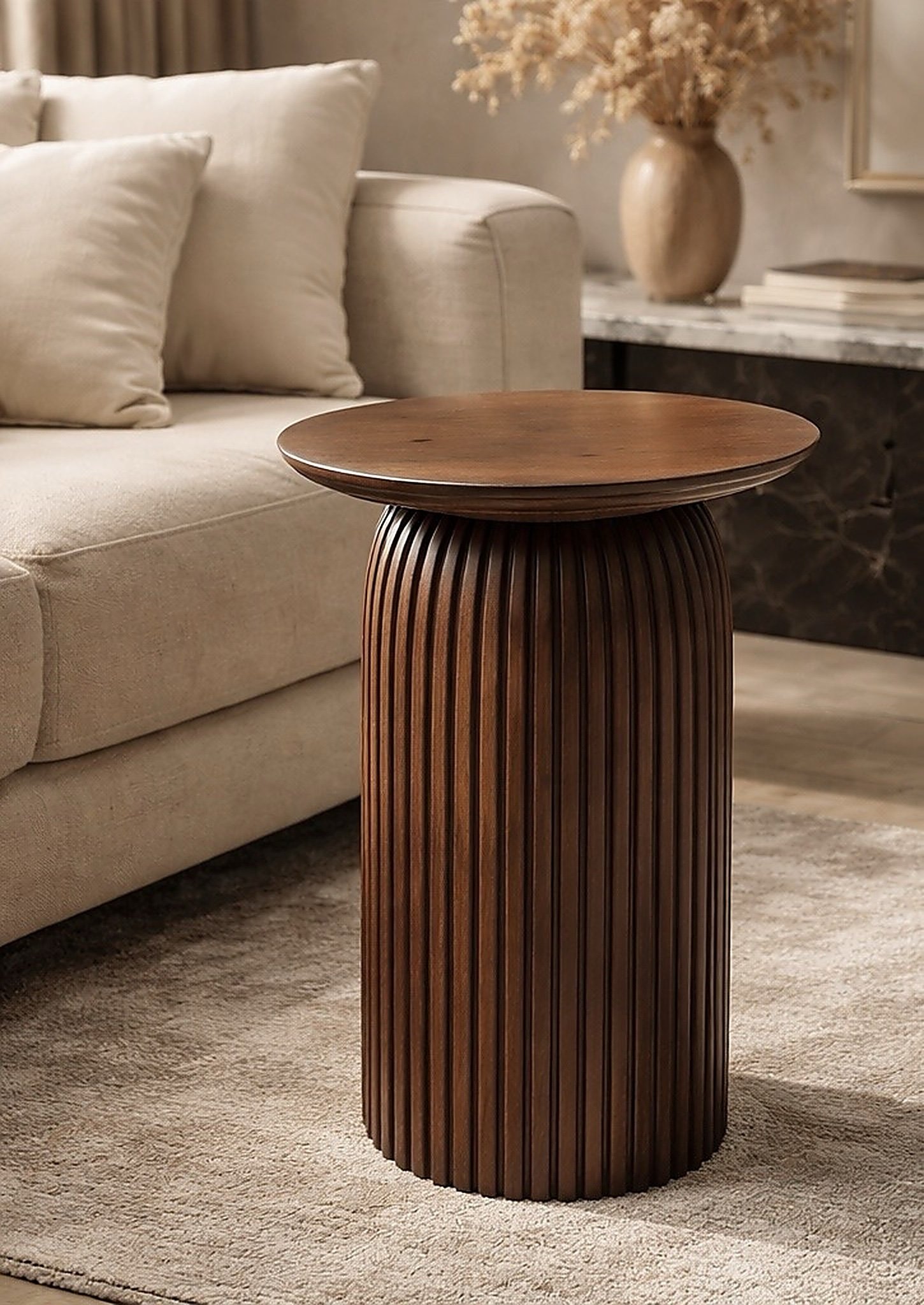 The vertical ribbed base adds texture and elegance, making it a perfect accent piece beside sofas or lounge chairs.