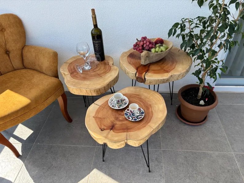 A set of natural wood slice nesting tables featuring organic round cuts. Each piece showcases unique grain patterns and natural variations. Black metal legs create a perfect balance between rustic and industrial design.