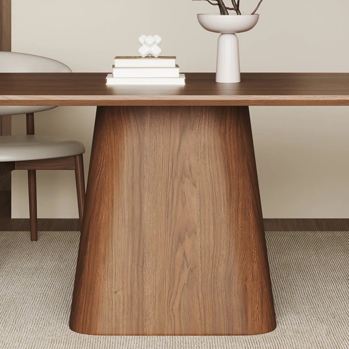 The table is paired with ergonomically designed upholstered chairs, offering exceptional comfort while maintaining a clean, minimalist silhouette. Every detail is thoughtfully considered — from the softly rounded tabletop to the solid central base that provides both stability and visual harmony.
