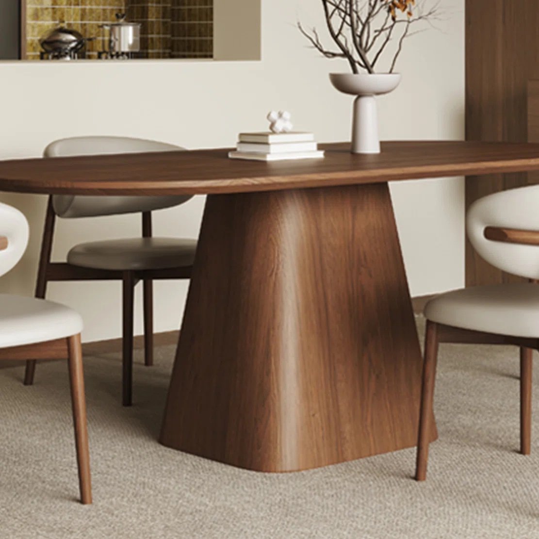 • Solid wood dining table with sculptural oval form